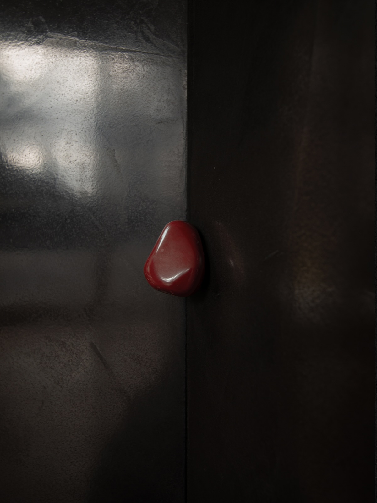 The cabinet unfolds like a stage, like an opera in miniature. Its subtly zig-zagged facade orchestrates light and shadow, creating depth, rhythm and movement. The doors, finished in hand-pigmented stucco technique, shimmer with a disciplined sheen, built layer by layer through process. A red stone handle marks a dramatic moment within the composition, like a soloist stepping into the light. It draws attention, introduces tactility and transforms the minimal into something intimate and alive.